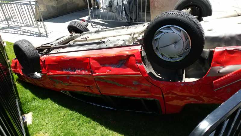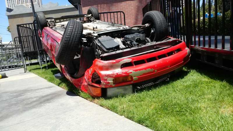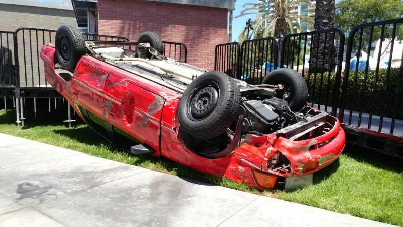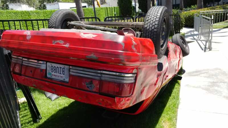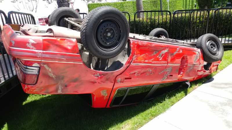 Flipped car display for The Tick Takeover Experience At San Diego Comic-Con 2017. Started with a blemish-free used car, changed the color to red, removed all fluids, added a roll-bar, flipped and anchored to a 3/4″ steel plate, dented and aged to the client’s specifications, and made safe by removing sharp edges and hazards for guests. Provided engineering drawings and LA city welding certifications per request by the city. Wired and programmed the headlights, turn signals and brake lights to be animated, and plumbed the car for fog/smoke effects.