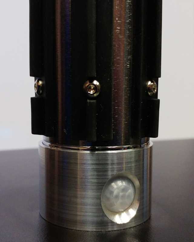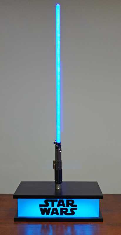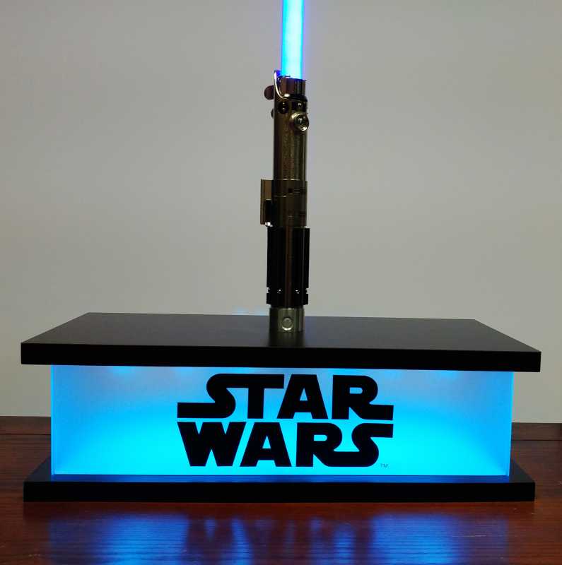 A run of light saber stands for Disney theme parks in California and Florida. The base is made from laminated mdf and frosted acrylic with color changing leds. The displayed lightsaber is sold by Disney and normally battery-powered. We wired it so it can be plugged into the wall power, and added a motion sensor in a machined ring between the base and the light saber. The motion sensor triggers the on-off switch for a set duration to incorporate guest interaction.